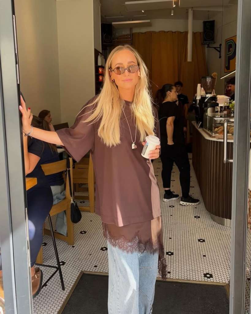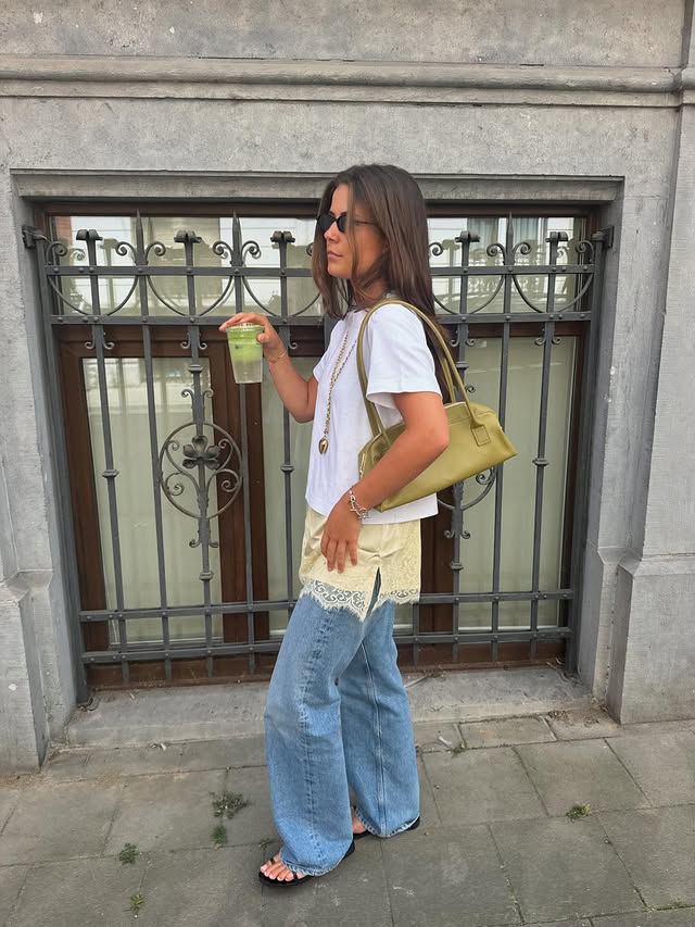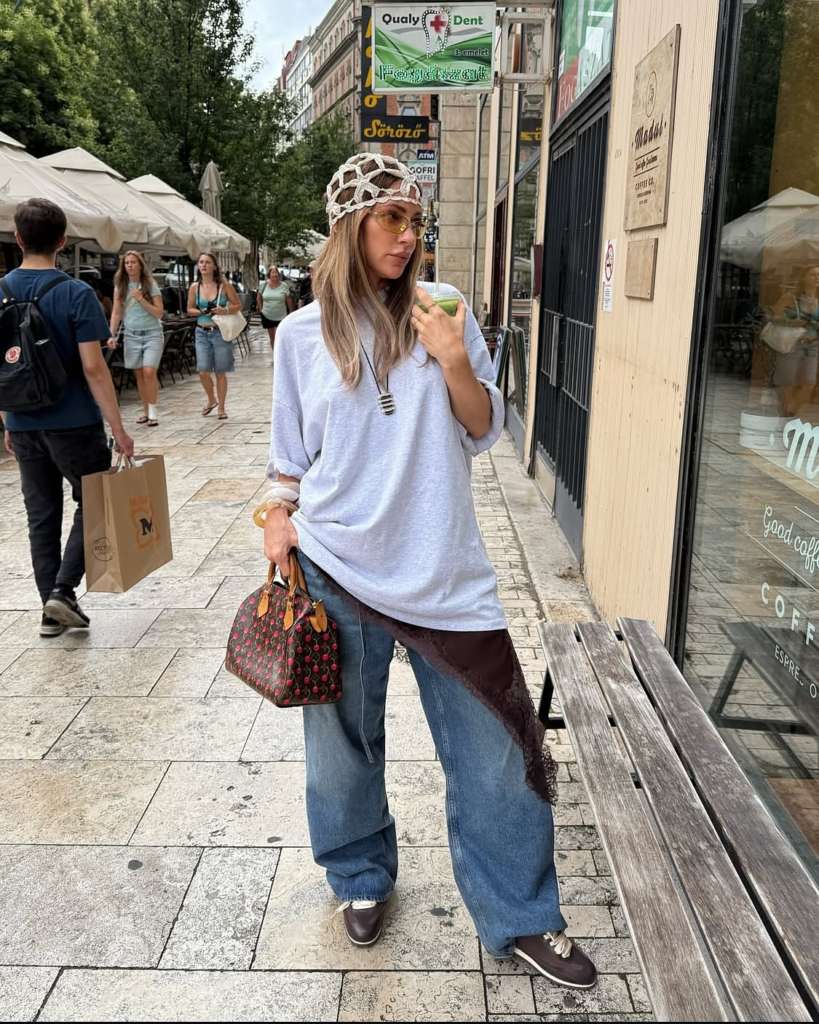 Outra proposta que já conquistou as fashionistas é apostar em camisetas oversized por cima de peças rendadas. O detalhe aparece na barra como um toque proposital, quase um truque de estilo para fugir do óbvio.