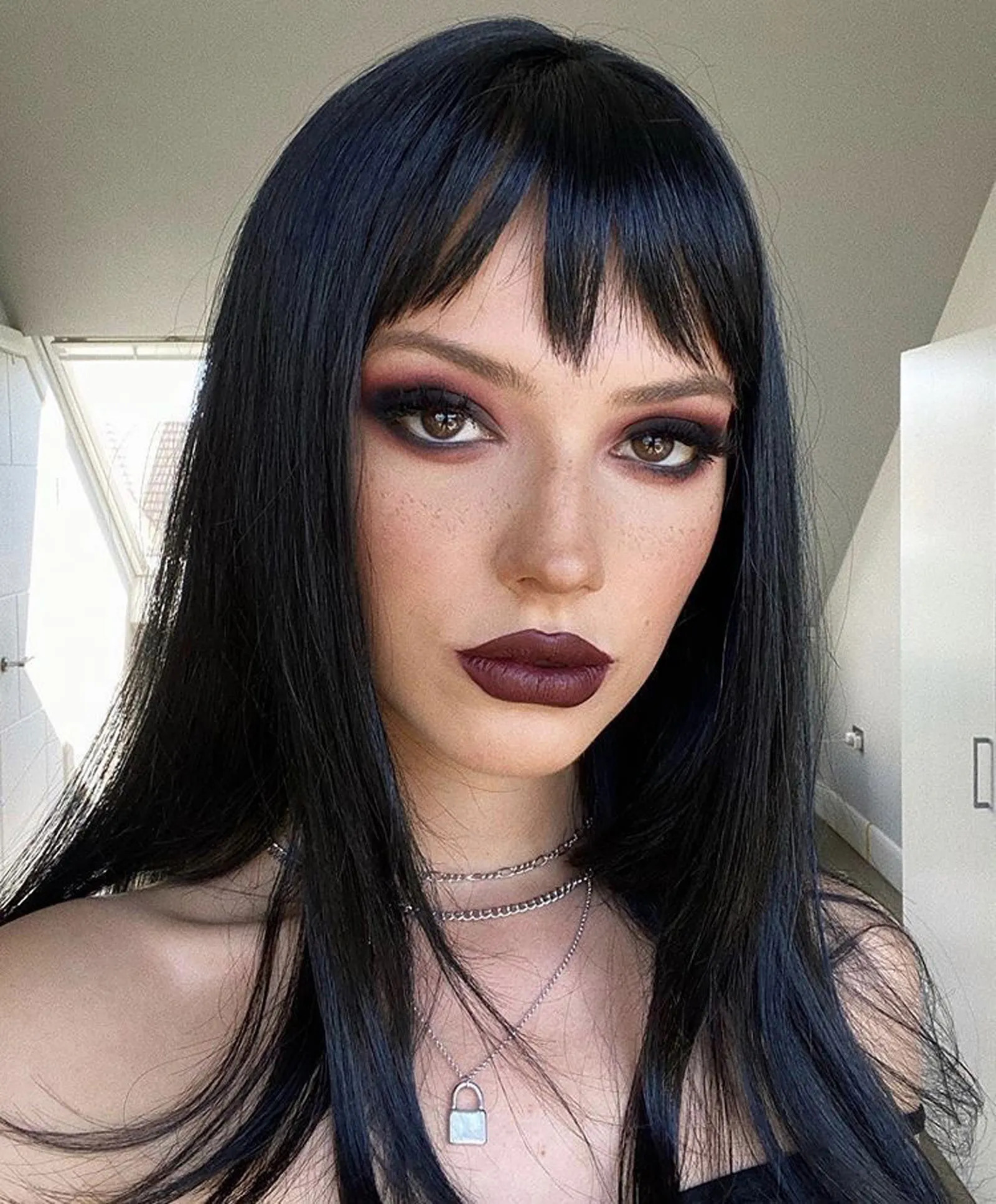Entre as maquiagens mais procuradas está a pele “vamp glam” que se destaca em misturar o iluminador com uma cor de base mais clara como de costume e aplicar no rosto, criando um efeito quase translúcido, como se a pele refletisse o luar. Para essa beleza assustadora, o olhar é o protagonista. Faça um delineado preto, e aplique sombras em tons de berinjela e pigmentos cintilantes para um olhar sedutor e atraente.