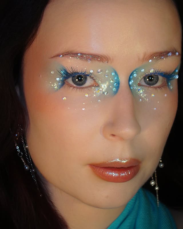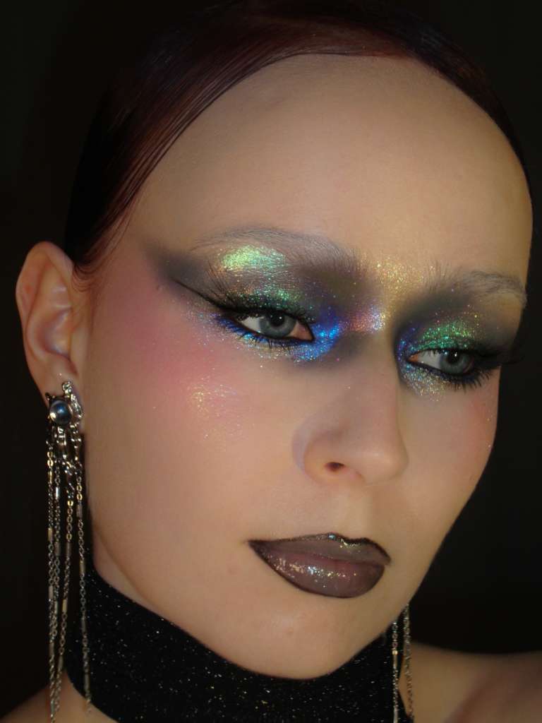 Nos olhos, a maquiagem futurista e iluminada para o carnaval 2026 pede formatos gráficos e cores que remetem ao espaço sideral. O uso de sombras prata com efeito metalizado é o ponto alto dessa composição, especialmente quando aplicadas de forma fluida nas pálpebras e espalhando até mesmo nas têmporas. Tons claros e frios, como o branco perolado e o azul glacial, ajudam a abrir o olhar dando aquele aspecto alienígena elegante que está em alta. O diferencial para este Carnaval é o uso de pigmentos holográficos que criam um efeito de arco-íris discreto, garantindo que o visual seja impactante tanto de dia quanto de noite.