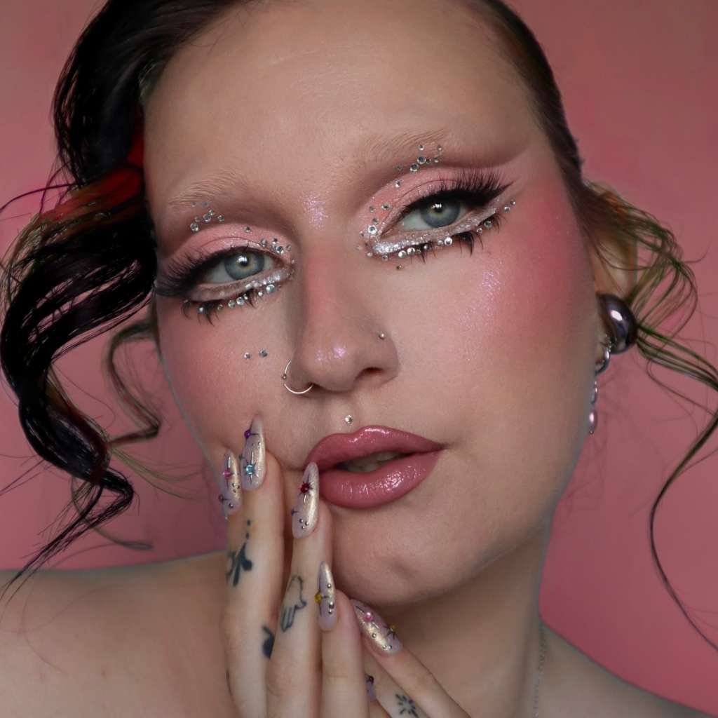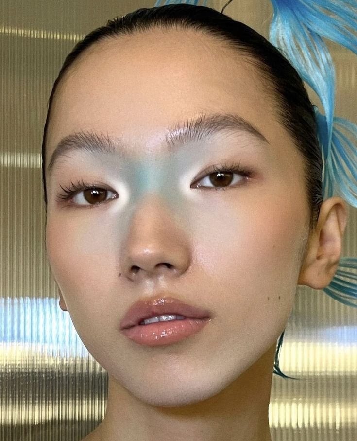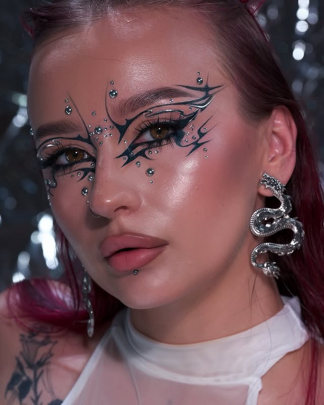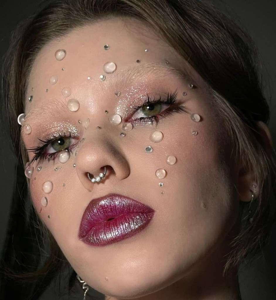 Além disso, delineados ou traços retos e orgânicos no estilo futurista são o auge dessa beleza. Finalizar os lábios em tons de nude metalizado ou contornos esfumados em cores escuras criam o contraste necessário para que o brilho se destaque ainda mais, resultando em uma beleza completa, autoral e totalmente alinhada ao futuro da beleza.