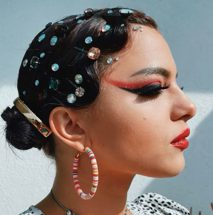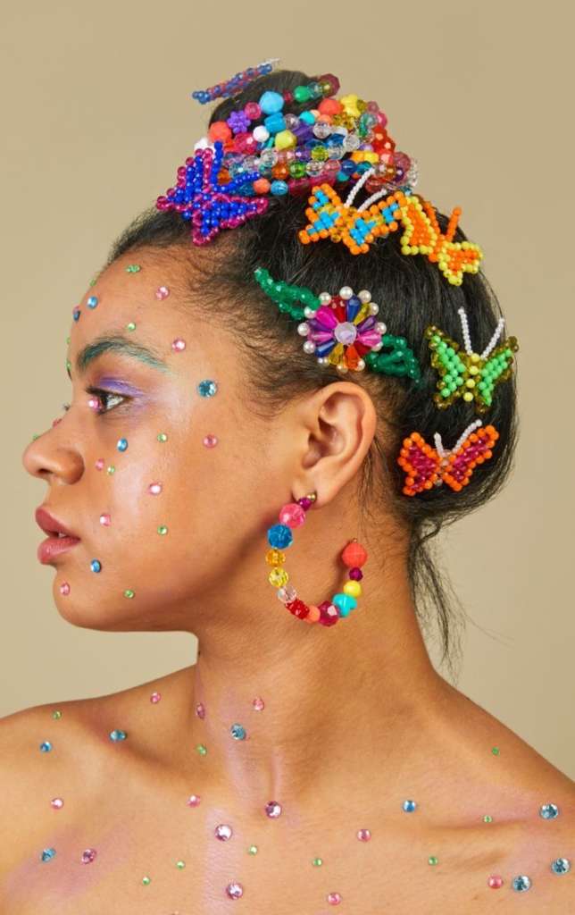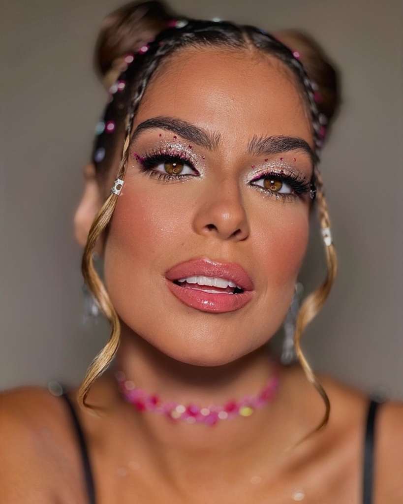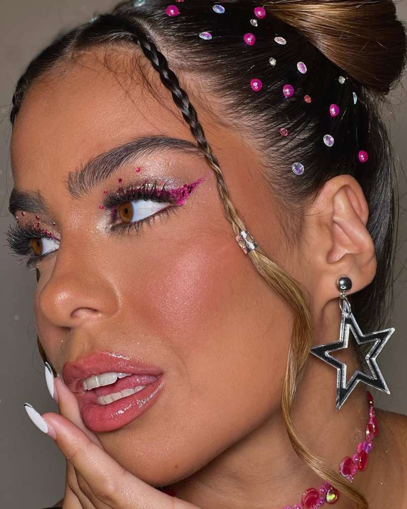 Manter a nuca livre é uma estratégia inteligente para aproveitar a folia sem passar calor. Para quem busca um visual descolado, o coque duplo mais conhecido como space buns, com mini tranças frontais, também é um penteado super fashionista perfeito para os dias de folia! Complemente o visual dos cabelos com adesivos de pedrarias, fica um charme.