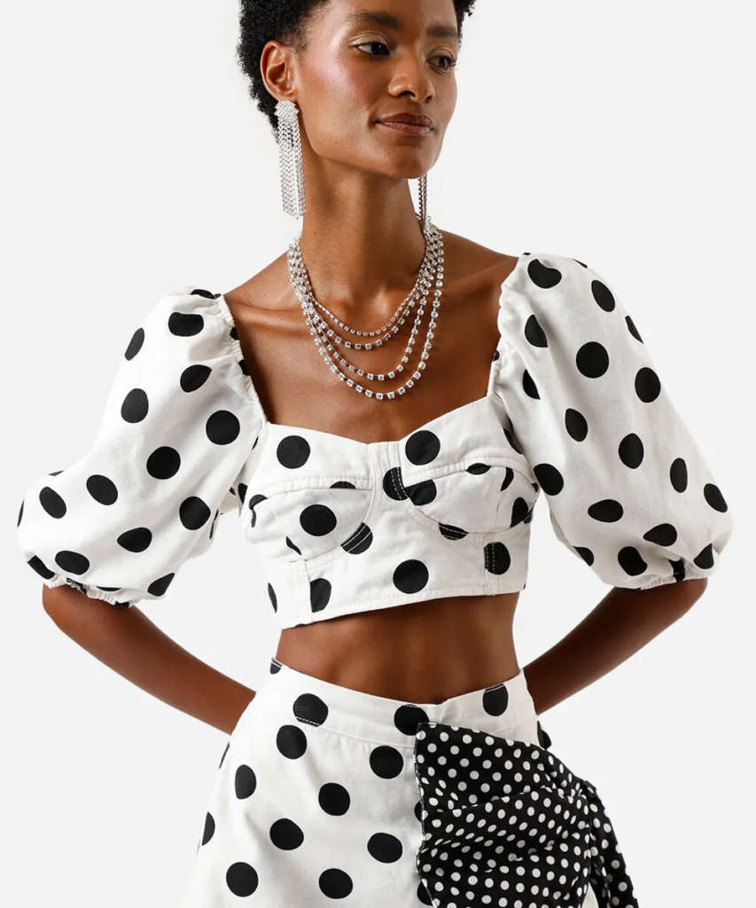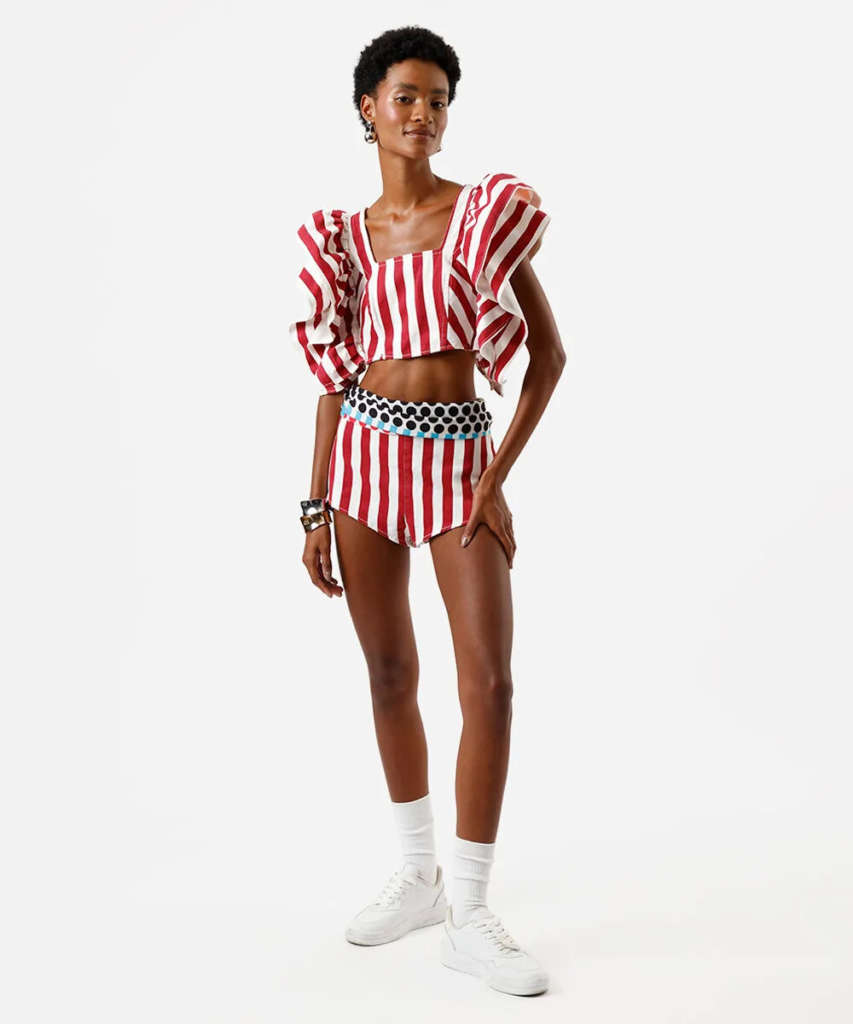 A coleção se divide em dois universos visuais que se fundem perfeitamente. O brilho cósmico traz o futurismo para a avenida, nossa dica é apostar no prateado, lurex e texturas metalizadas que garantem destaque sob qualquer luz. Em contrapartida, a explosão tropical resgata o DNA brasileiro. Aqui, destacamos o charme dos poás clássicos em vermelho e branco e as listras que homenageiam a parceria com a Imperatriz.