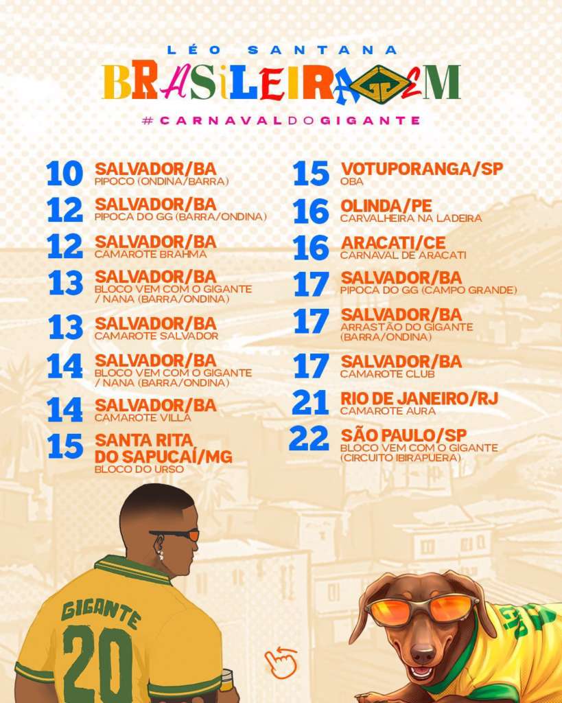 Preparados para acompanhar a maratona de shows do cantor, que começa dia 10 no PIPOCO em Salvador, passa por passa por São Paulo, Rio de Janeiro, Minas Gerais, Ceará e Pernambuco, e só acaba no dia 22/02 no pós carnaval de São Paulo, no Bloco Vem com o Gigante? Let’s go?!