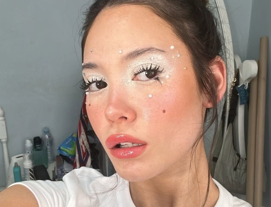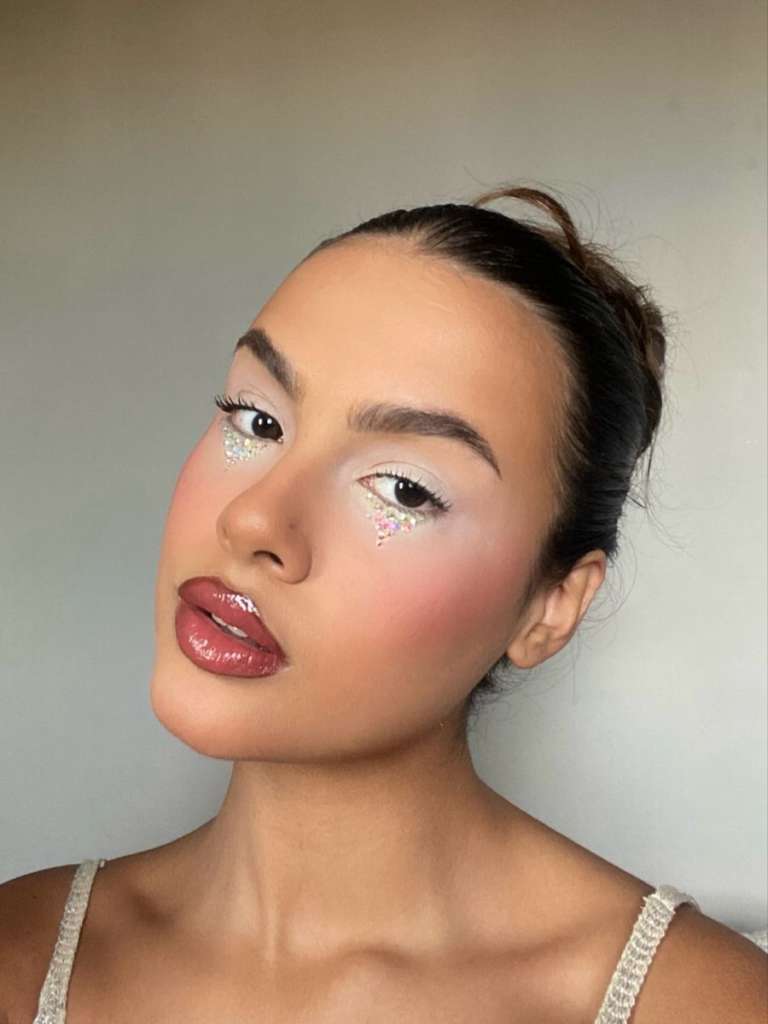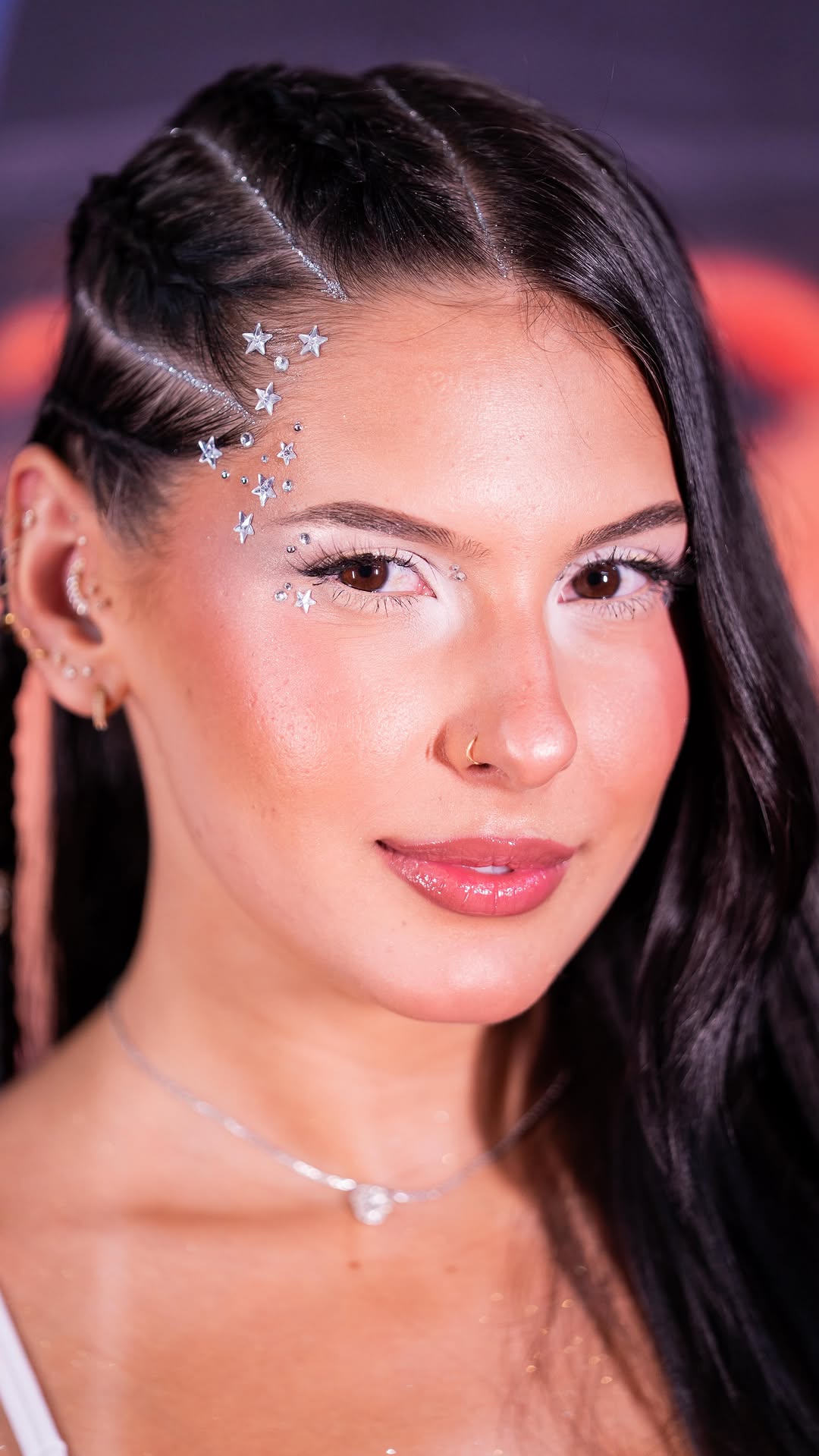 A sombra branca deixou de ser um item retrô para se tornar a protagonista da maquiagem moderna. A dica para reproduzir o look é construir aos poucos camadas com a sombra em toda a pálpebra móvel. O diferencial do visual da Ana Castela está nos detalhes, com a aplicação de pedrarias de strass em formatos de estrela, criando pontos de luz ao redor dos olhos e subindo para as têmporas.