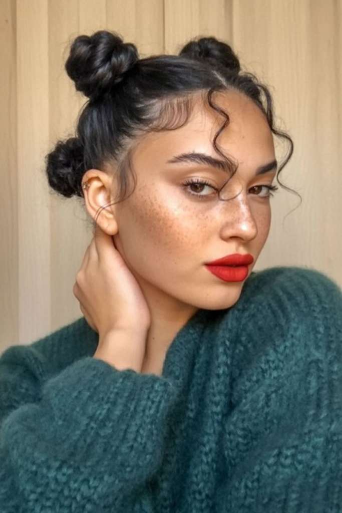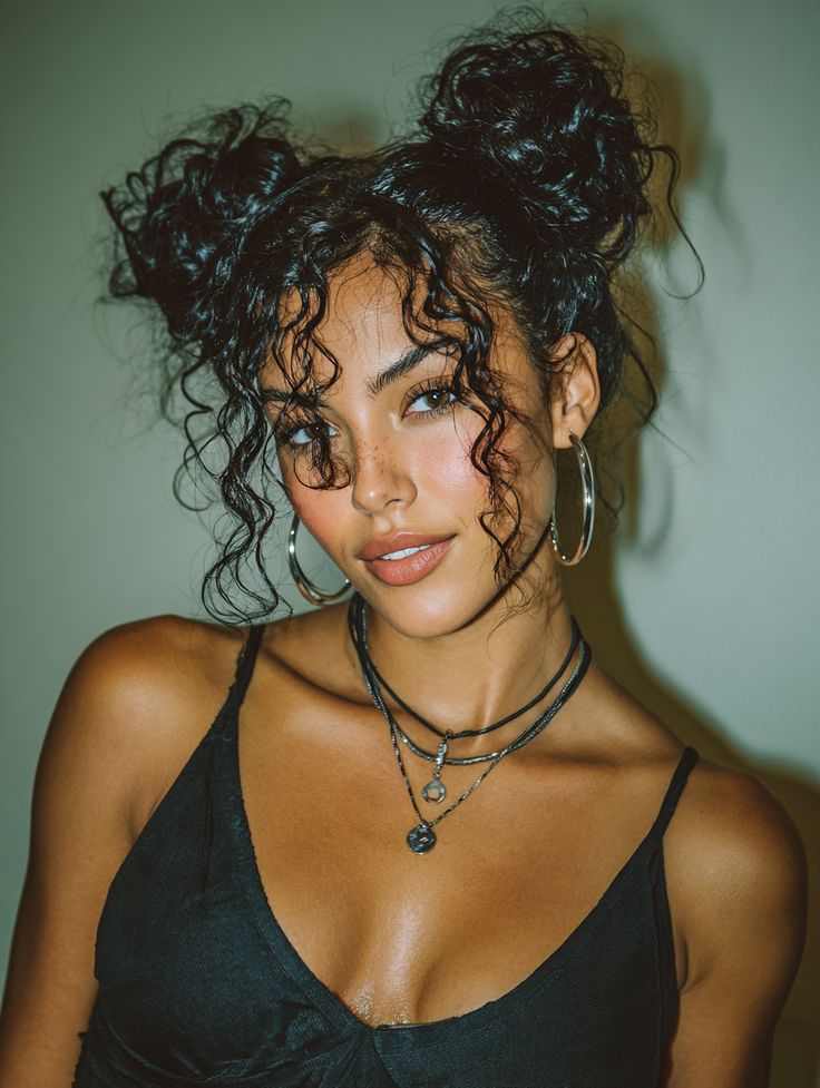 Uma das opções mais queridinhas e divertidas é o Space Buns, aquela maria chiquinha alta que ganha um charme extra em fios cacheados. O grande truque aqui é deixar as pontas frontais soltas, permitindo que os cachos exibam seu movimento natural.