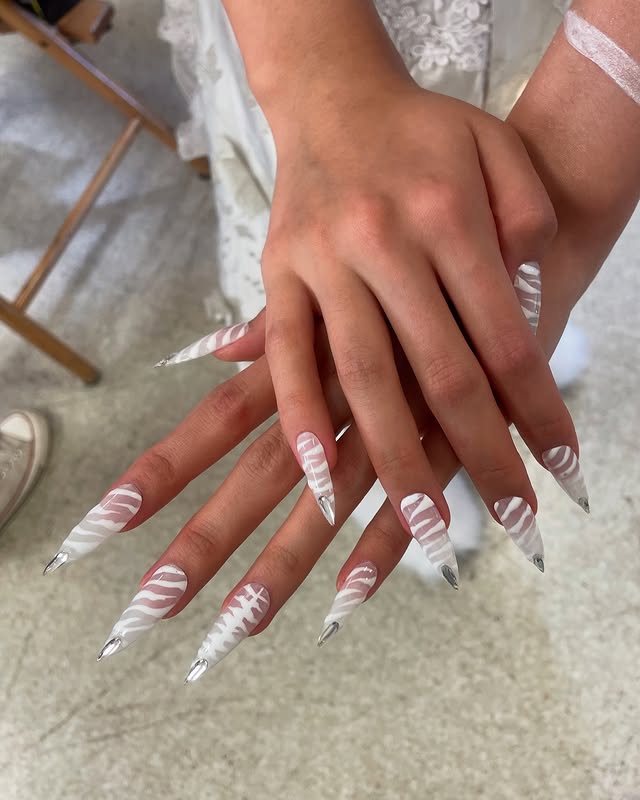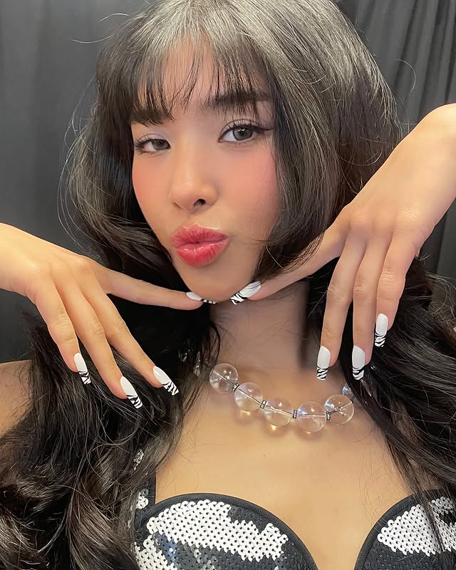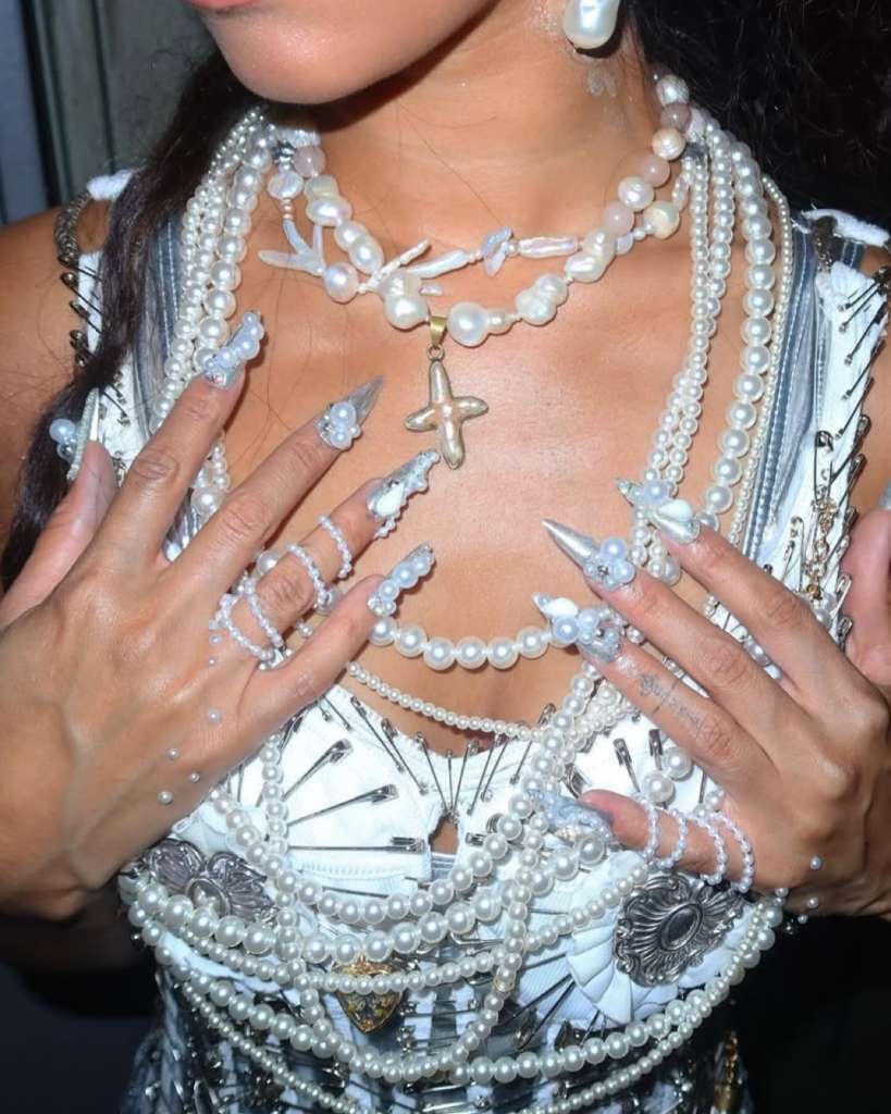 Para quem prefere uma estética mais iluminada, a inspiração surge diretamente da performance do grupo no Grammy, onde o branco Cloud Dancer encontrou o brilho magnético dos cristais. Manon e Yoonchae mostraram que até a clássica francesinha pode ser reinventada através de correntes de strass e acabamentos metalizados.