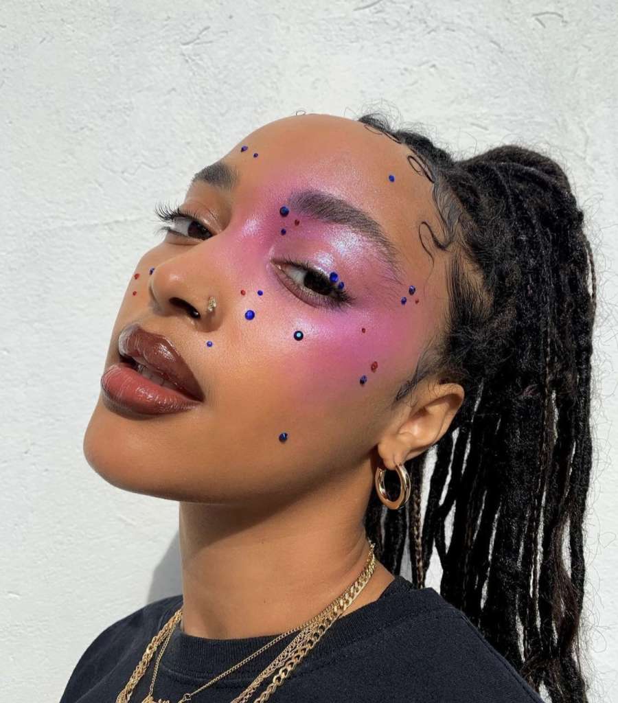 Para conquistar o olhar marcante de Zara Larsson, invista em sombras metalizadas e pedrarias. O primeiro passo é usar uma base de sombra cremosa para garantir que nada saia do lugar no calor. Em seguida, aplique pigmentos finos no centro da pálpebra para dar dimensão. O toque final fica por conta dos cristais adesivos no canto interno ou externo dos olhos. Eles são práticos e garantem aquele efeito “uau” que o Carnaval pede.