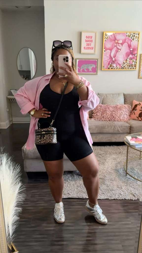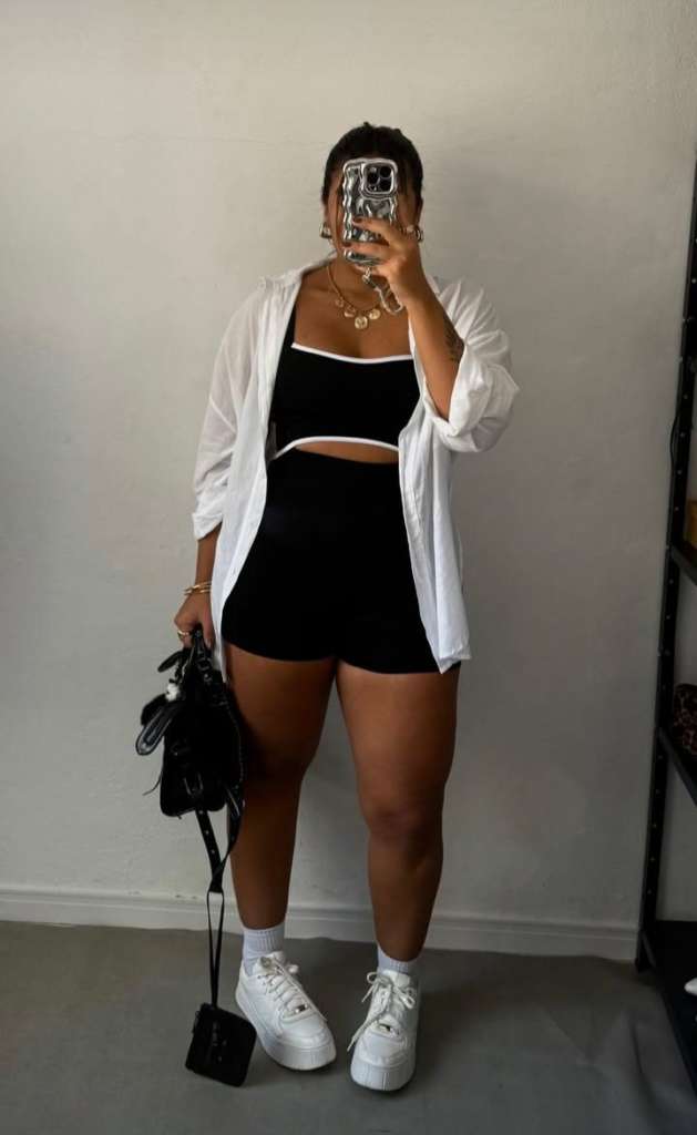 O clássico denim sobre denim também ganha uma releitura rock’n’roll. Shorts jeans destroyed (rasgado) com coletes oversized e cintos de correntes criam uma estética rebelde e atemporal. Se a sua pegada for mais urbana, o macaquinho de ciclista (Biker Short) com uma camiseta por cima é a escolha certa do estilo athleisure, priorizando a mobilidade total para dançar.