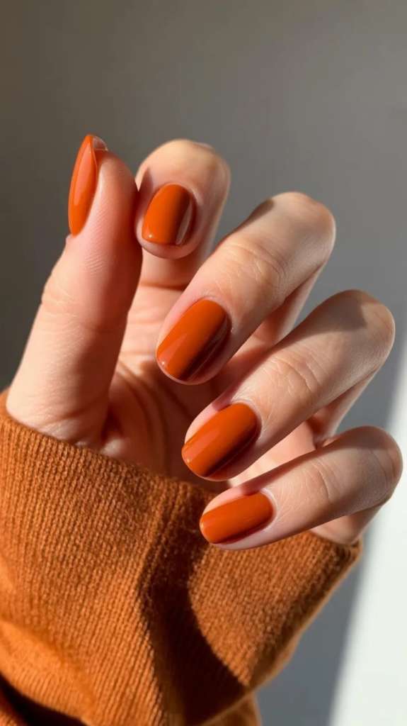 O laranja tijolo é a essência do outono. Por ser uma cor quente, ele traz energia para o visual e harmoniza perfeitamente com acessórios prata e dourado. É a escolha ideal para quem gosta de unhas vibrantes, mas com toque elegante.