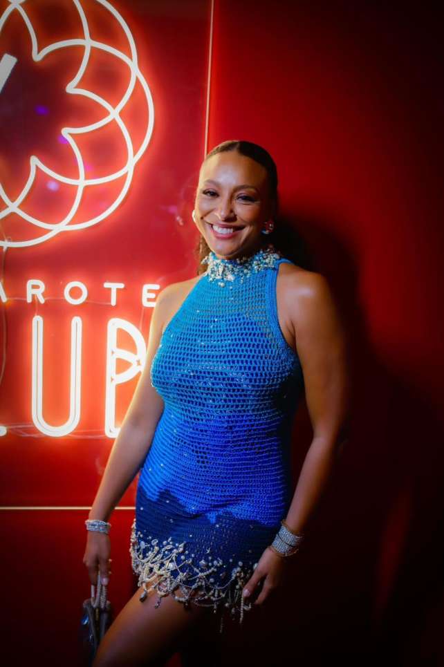 Rainha do Camarote Allegria, Patrícia Poeta escolheu um mini vestido criado por Letícia Manzan num dos espaços mais badalados da Sapucaí.
