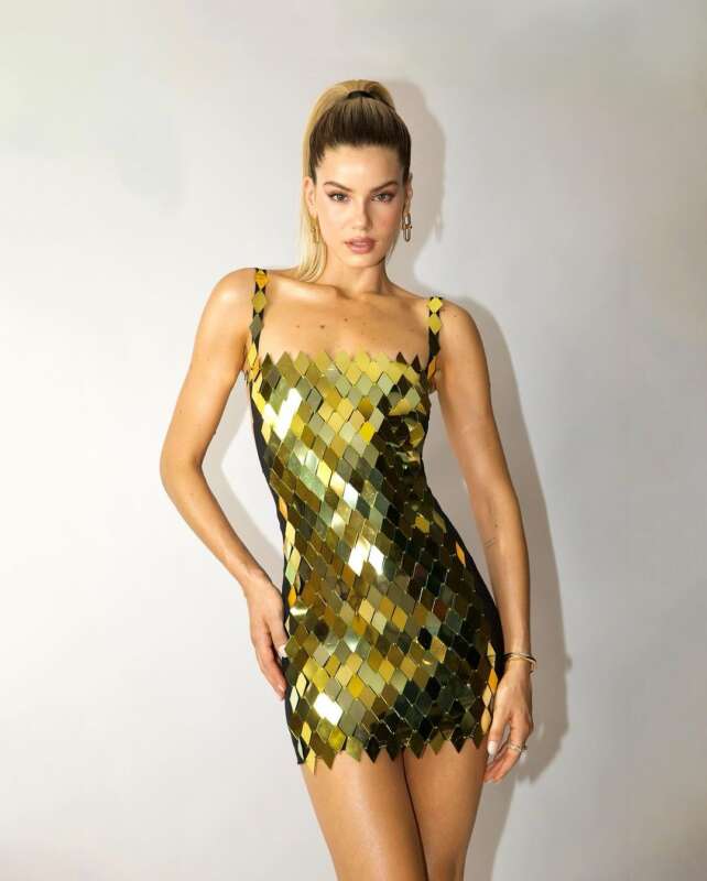 Atriz e modelo aposta em look dourado exclusivo criado por Gustavo Silvestre e batom escolhido pelo público, com beleza assinada por Lavoisier