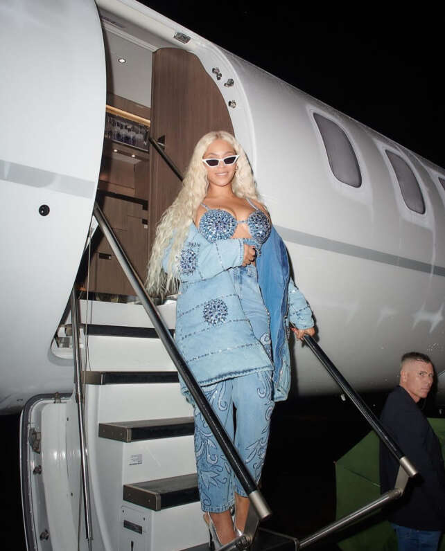 A estrela do pop Beyoncé usou um look da PatBo, composto por um casaco, top e calça bordados em algodão.