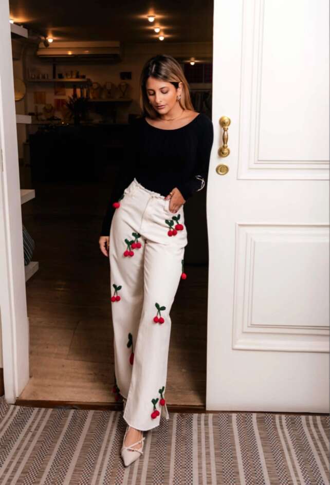 As cherry pants são calças com penduricalhos de crochê em formato de cerejas que adicionam uma dose de diversão e criatividade.