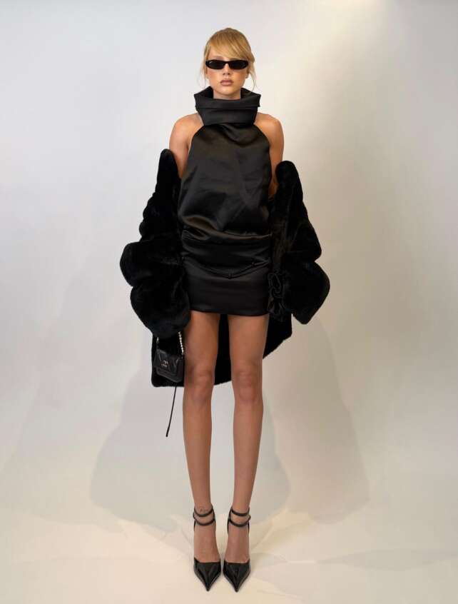 Malu Borges rouba a cena no aniversário de Bruna Marquezine com um minivestido em cetim preto da Fancì Club, peça marcada pela gola alta escultural e pelo decote profundo nas costas. A escolha ganhou ainda mais dramaticidade com a sobreposição de um casaco volumoso e acessórios certeiros — óculos slim, bolsa compacta e scarpins de tiras finas.…